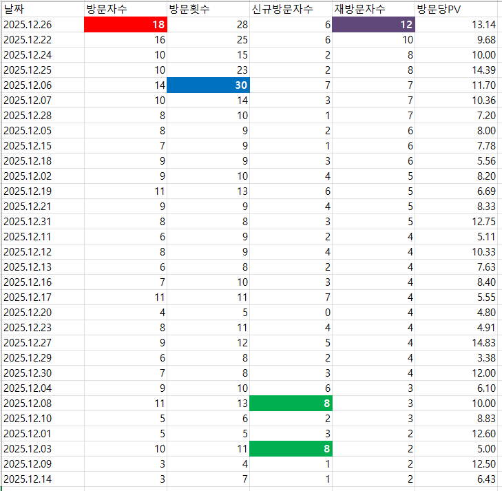 방문자 수가 가장 많았던 날 : 12월 26일 18명 방문